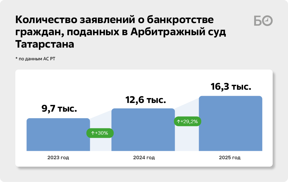 В 2025 году в Арбитражный суд Татарстана (АС РТ) от населения поступило 16,3 тыс. заявлений о банкротстве, что составляет 96% от общего числа дел о несостоятельности