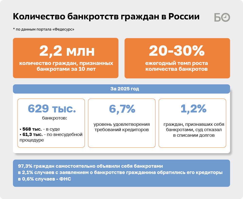 В 2025-м уровень удовлетворения требований кредиторов в делах о банкротстве физических лиц составил около 6,7%. В большинстве процедур у должника отсутствует имущество, пригодное для расчетов с кредиторами. При этом слегка вырос процент дел, где гражданина не освободили от долгов, — 1,2% (вместо 1,1% в 2024-м).