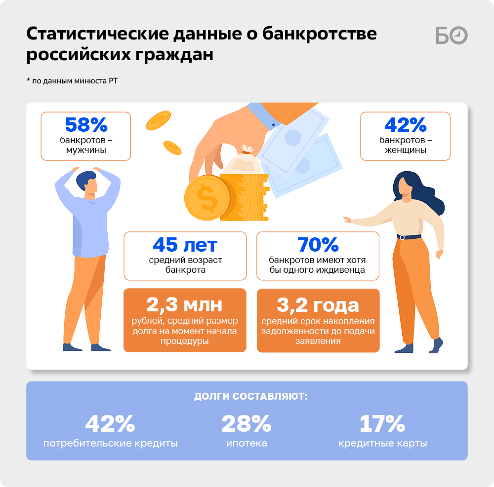 В структуре долгов преобладают потребительские кредиты (42%), ипотека (28%) и долги по кредитным картам (17%). Средний возраст банкрота в России составляет 45 лет, 58% банкротов — мужчины, а 42% — женщины. 70% от числа всех банкротов имеют хотя бы одного иждивенца.