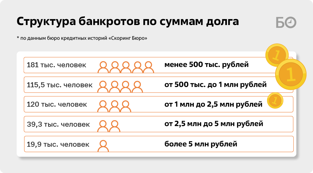 «Состоятельных» банкротов (сумма долга более 5 млн рублей) — 19,9 тыс. человек.