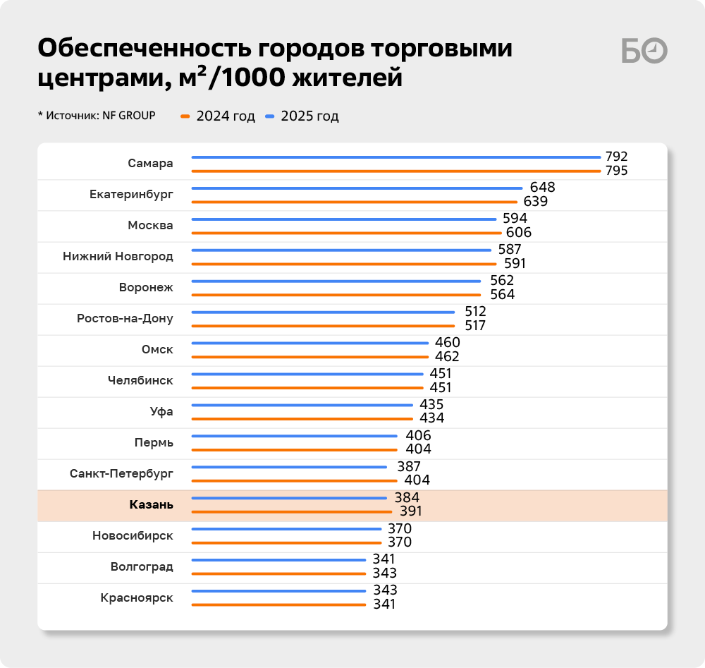 Рынок торговых центров в других городах начинает сжиматься уже сейчас. С 2024 по 2025 год у одного из лидеров рейтинга, Екатеринбурга, снизилось количество торговых площадей сразу на 9% — с 648 до 639 кв. метров. Отдельные ТЦ стали закрываться по решению суда из-за несоблюдения норм пожарной безопасности и требований антитеррористической защиты. Чуть снизилась обеспеченность моллами в Уфе и Перми.