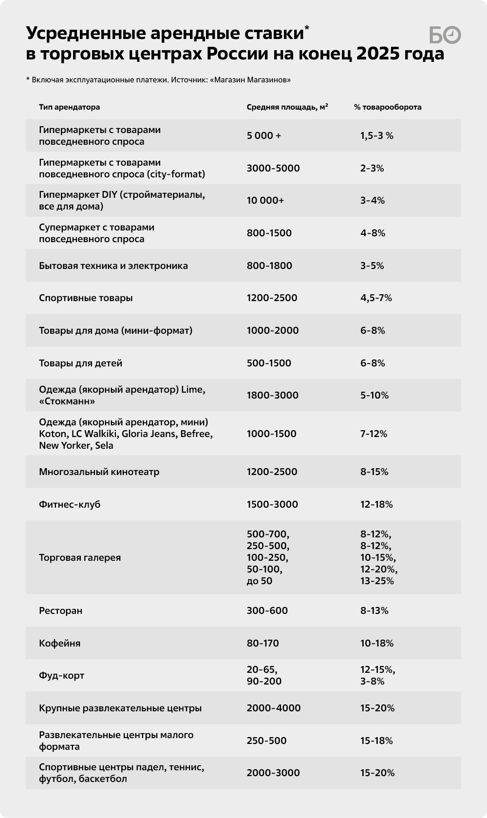 Также высоки арендные ставки для кинотеатров (8–15% от товарооборота), фитнес-центров средней площадью от 1,5 тыс. до 3 тыс. кв. м (12–18%), ресторанов (8–13%), кофеен (10–18%) и развлекательных центров малого формата — порядка 250–500 «квадратов» (15–18%).