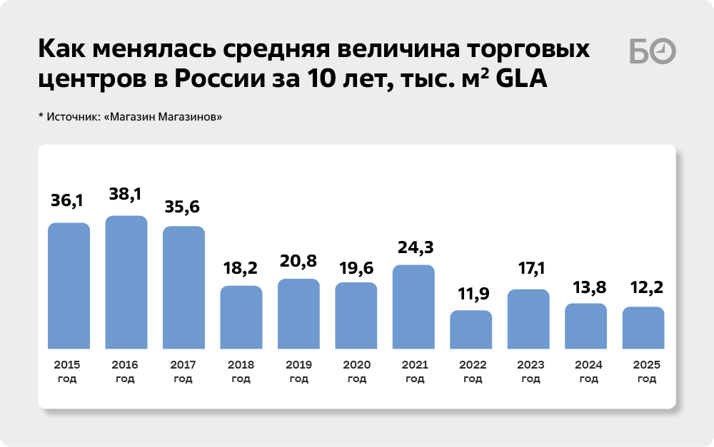 «Средняя величина нового торгового центра в России продолжает снижаться и по итогам 2025 года составила 12,2 тыcячи квадратных метров GLA (а без учета двух крупных торгово-развлекательных центров Avenue Sever и „Голливуд“ показатель вообще составил бы 9,9 тысячи квадратных метров GLA). Таким образом, фактически большинство открытых в 2025 году новых торговых центров являются небольшими объектами районного масштаба», — отмечали в итоговом обзоре рынка в компании «Магазин Магазинов». В этом году средний размер нового торгового центра может достигнуть 16,4 тыс. кв. м GLA, но и то с оговоркой: если откроется крупный объект, например ТЦ «Золотой» в Екатеринбурге с 137,9 тыс. «квадратов» GLA…