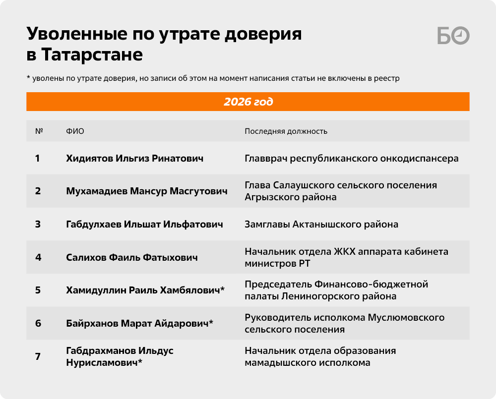 В декабре 2025-го уволен со службы начальник отдела по молодежной политике, спорту и туризму исполкома Рыбно-Слободского района Ленар Хабибуллин, в 2023-м за долги перед судебными приставами освободил свое кресло помощник главы Менделеевского района РТ Рустем Сабитов.