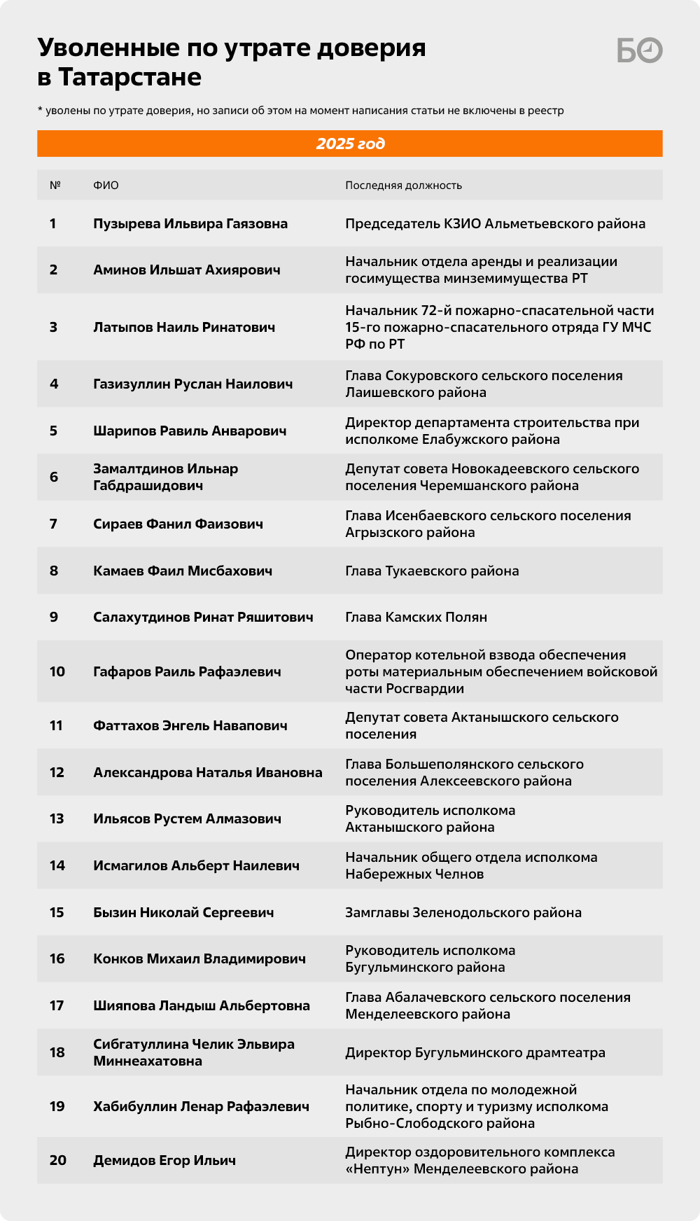 В апреле 2025 года покинул пост Наиль Латыпов, начальник 72-й пожарно-спасательной части 15-го пожарно-спасательного отряда ГУ МЧС РФ по Татарстану. Через полгода прокуратура уволила оператора котельной взвода обеспечения роты материальным обеспечением войсковой части Росгвардии Раиля Гафарова.
