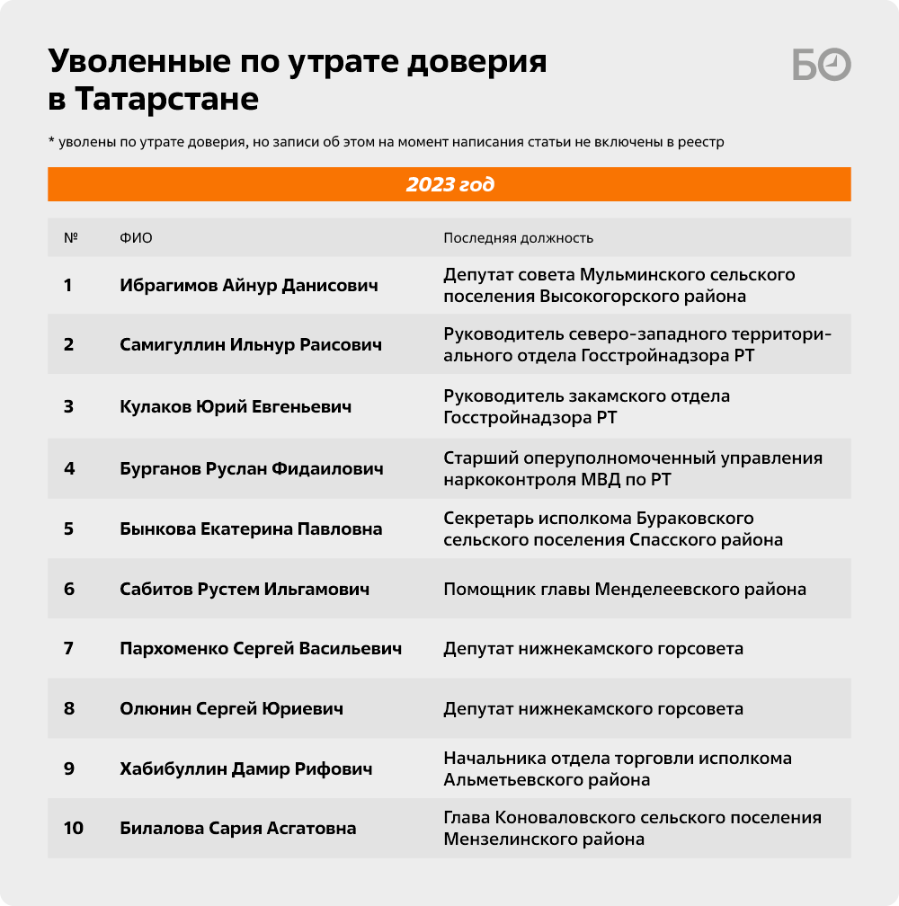 По утрате доверия также лишились своих должностей депутат Сарлинского сельского поселения Азнакаевского района Ленар Хазиев, депутаты Нижнекамского горсовета Сергей Пархоменко и Сергей Олюнин, депутаты Мульминского сельского поселения Высокогорского района Айнур Ибрагимов и Рафик Абдуллин, депутат Чалпинского сельского поселения Азнакаевского района Рафис Усманов, депутат Чистопольского горсовета Рудольф Зяббаров и депутат Краснокадкинского сельского поселения Нижнекамского района Алсу Камалиева.