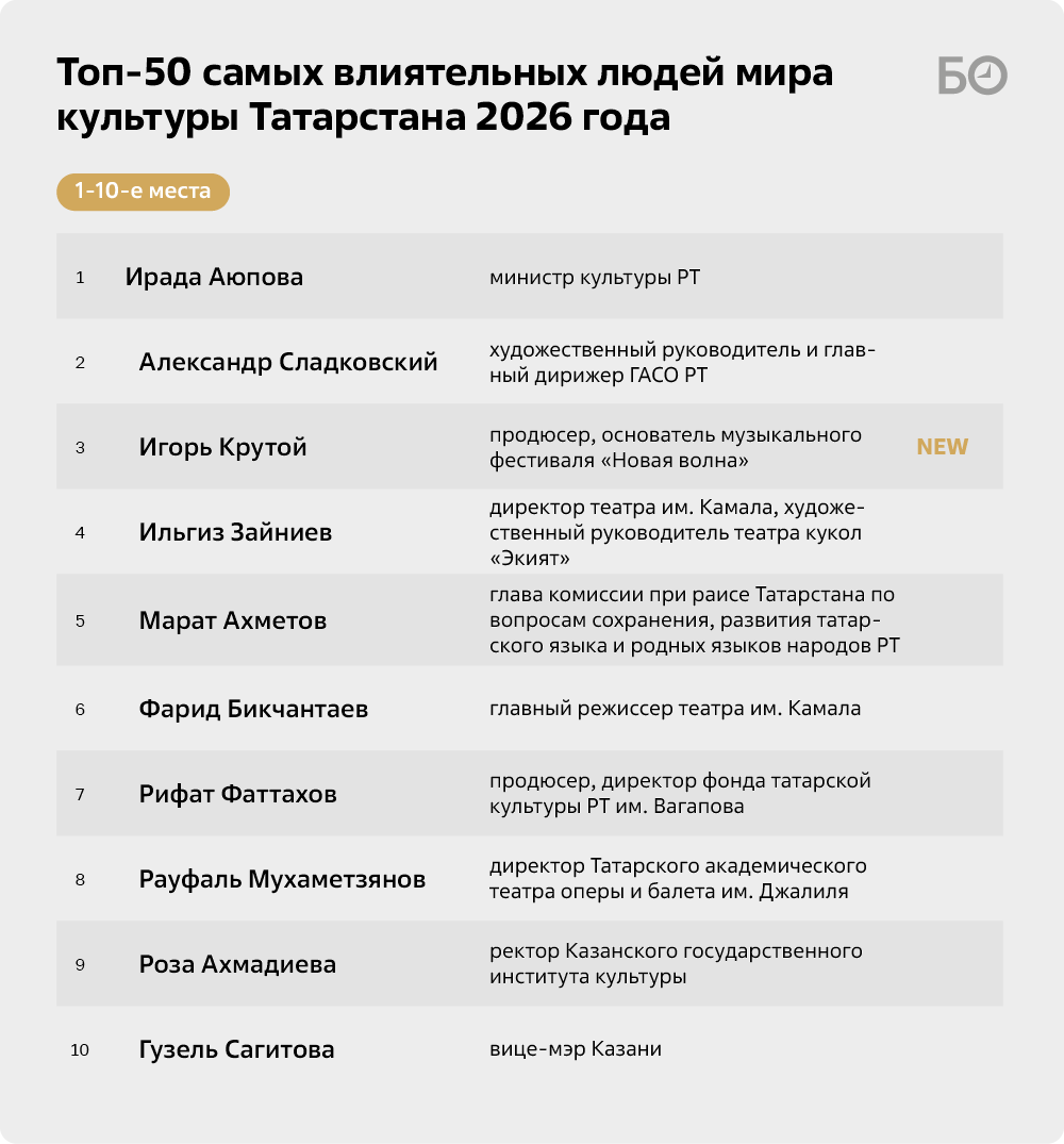 Замыкает первую десятку вице-мэр Казани Гузель Сагитова, которая за последние годы заметно усилила влияние на городскую культурную повестку и фактически выстроила собственную систему проектов с устойчивым кадровым ядром. Основанное ею в 2013 году объединение «Калеб» стало своеобразной кузницей новой татарской культурной сцены: через него прошли музыканты, поэты, драматурги, которые сегодня формируют лицо современной национальной культуры.