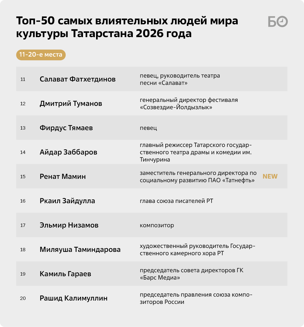 Председатель правления союза композиторов России Рашид Калимуллин (20), в 2024-м уступивший кресло главы союза композиторов РТ Камалу, также сдал несколько позиций, хотя и остался в первой двадцатке. Его фокус сегодня смещен на федеральный уровень — российский Дом композиторов требует куда больше внимания, чем региональная повестка. В результате в Татарстане Калимуллин присутствует скорее как символ и авторитет, чем как активный игрок. Впрочем, статус «живого классика» и востребованность в ведущих театрах страны пока компенсируют этот дистанционный формат влияния.