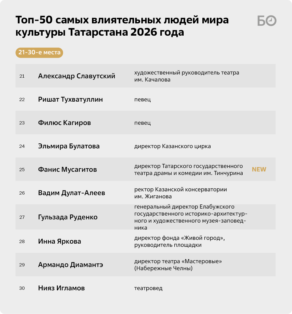 По-прежнему в топе директор театра «Мастеровые» (Набережные Челны) Армандо Диамантэ (29), чей ежегодный рост объясняется не аппаратными перестановками, а системной работой. В той же «зоне устойчивости» остается и гендиректор Елабужского государственного историко-архитектурного и художественного музея-заповедника Гульзада Руденко (27). Ректор Казанской консерватории Вадим Дулат-Алеев слегка просел в рейтинге, но все еще удерживается в верхней части списка (26).