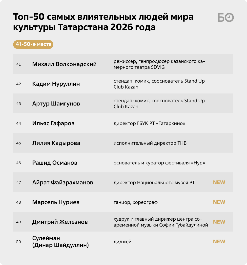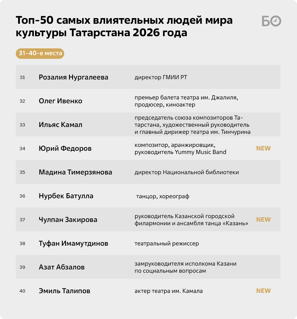 Покинули топ-50 также юный скрипач Лука Моромов, писатель Денис Осокин, композитор Резеда Ахиярова, пианист Борис Березовский. Впрочем, каждый из них может сюда вернуться. Скажем, если новую оперу или балет Ахияровой поставят в театре им. Джалиля или вновь вернется замечательный музыкальный фестиваль «Летние вечера в Елабуге», художественным руководителем которого является фигура международного масштаба в мире классической музыки Березовский.