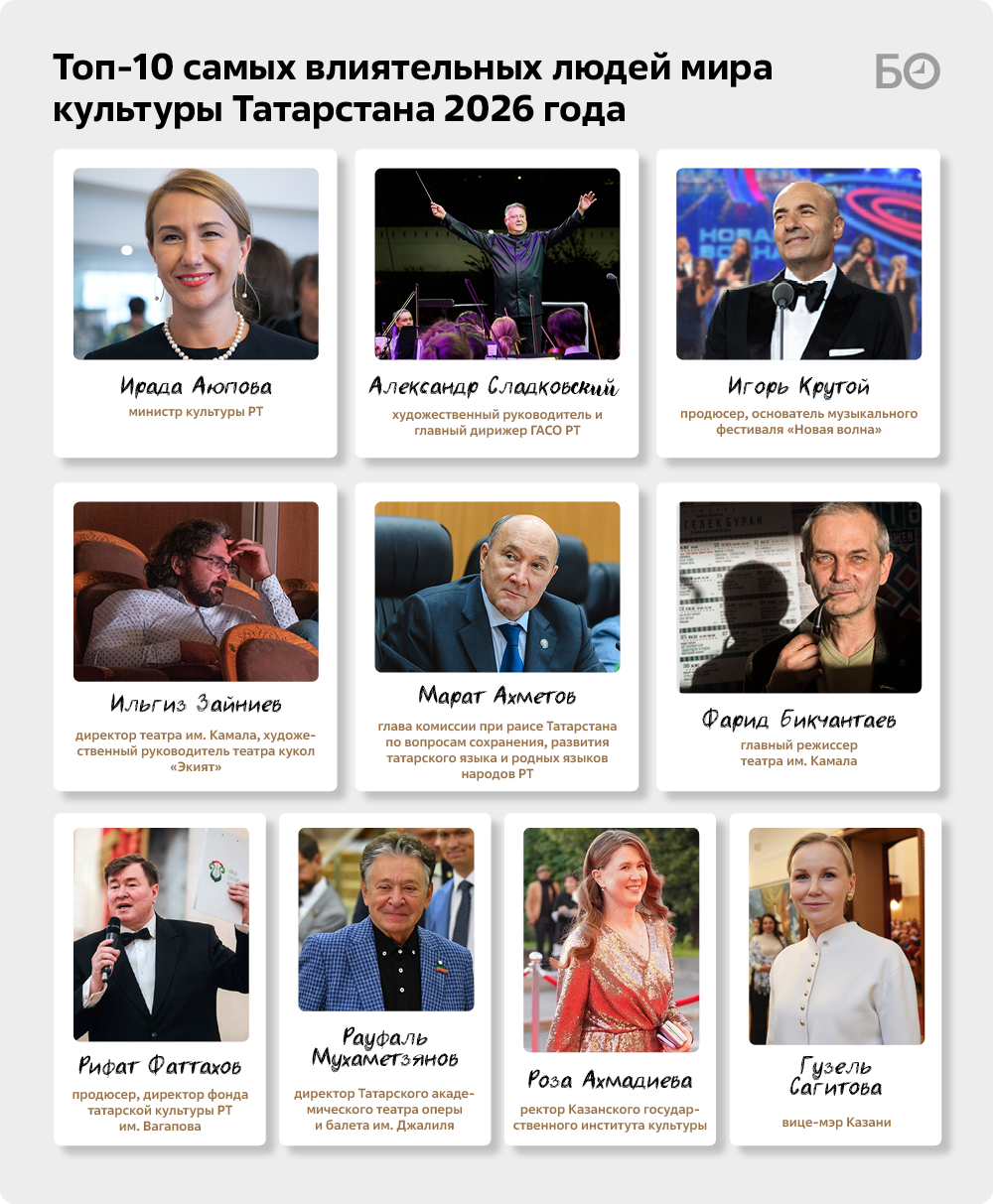 Традиционно в канун Дня родного языка и дня рождения Габдуллы Тукая наша редакция знакомит читателей со своим рейтингом самых влиятельных деятелей культуры РТ. Кстати, многие из них сегодня примут участие в ежегодном заседании совета по культуре при раисе республики, тема встречи заявлена как «Развитие гармонично-нравственной личности через призму культуры и образования». И это действительно вопрос: а дает ли нынешнее состояние татарстанской культуры возможности для гармоничного развития как творцов, так и публики? Приглашаем наших читателей присоединиться к обсуждению, согласившись или поспорив с выбором «БИЗНЕС Online» и наших экспертов.