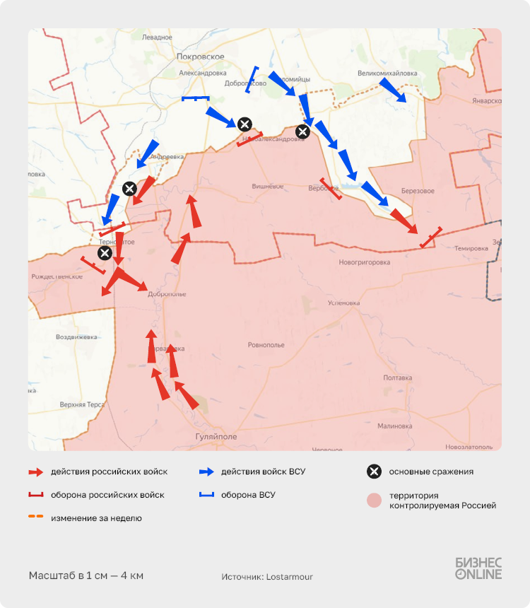На прошедшей неделе противник сумел захватить населенные пункты Андреевка, Братское, Христофоровка, зайти в Терноватое на западном фланге наступления. На восточном фланге он захватил Орестополь, Алексеевку, Сосновку, Калиновское.