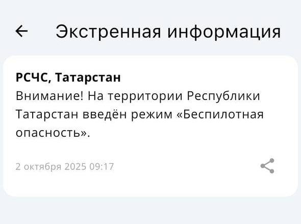 «Внимание! На территории Республики Татарстан введен режим „Беспилотная опасность“», — говорится в сообщении. Отметим, что о закрытии аэропортов в РТ не сообщалось.