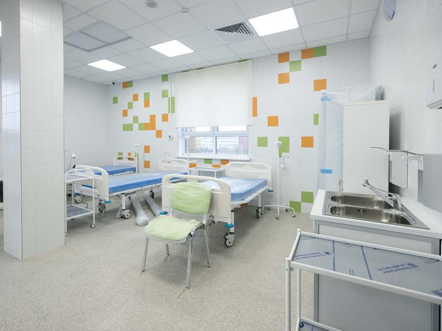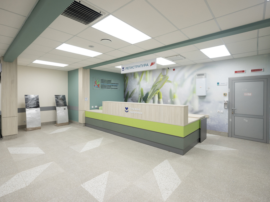 В новом пятиэтажном здании площадью 7,1 тыс. кв. м предусмотрено несколько входов: главный, отдельный фильтр-вход для пациентов с признаками заболеваний, а также вход для маломобильных граждан, ведущий сразу в травмпункт.