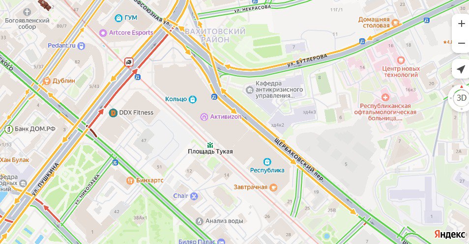 Судя по данным сервиса «Яндекс.Карты», движение в основном затруднено от улицы Островского до улицы Бутлерова.