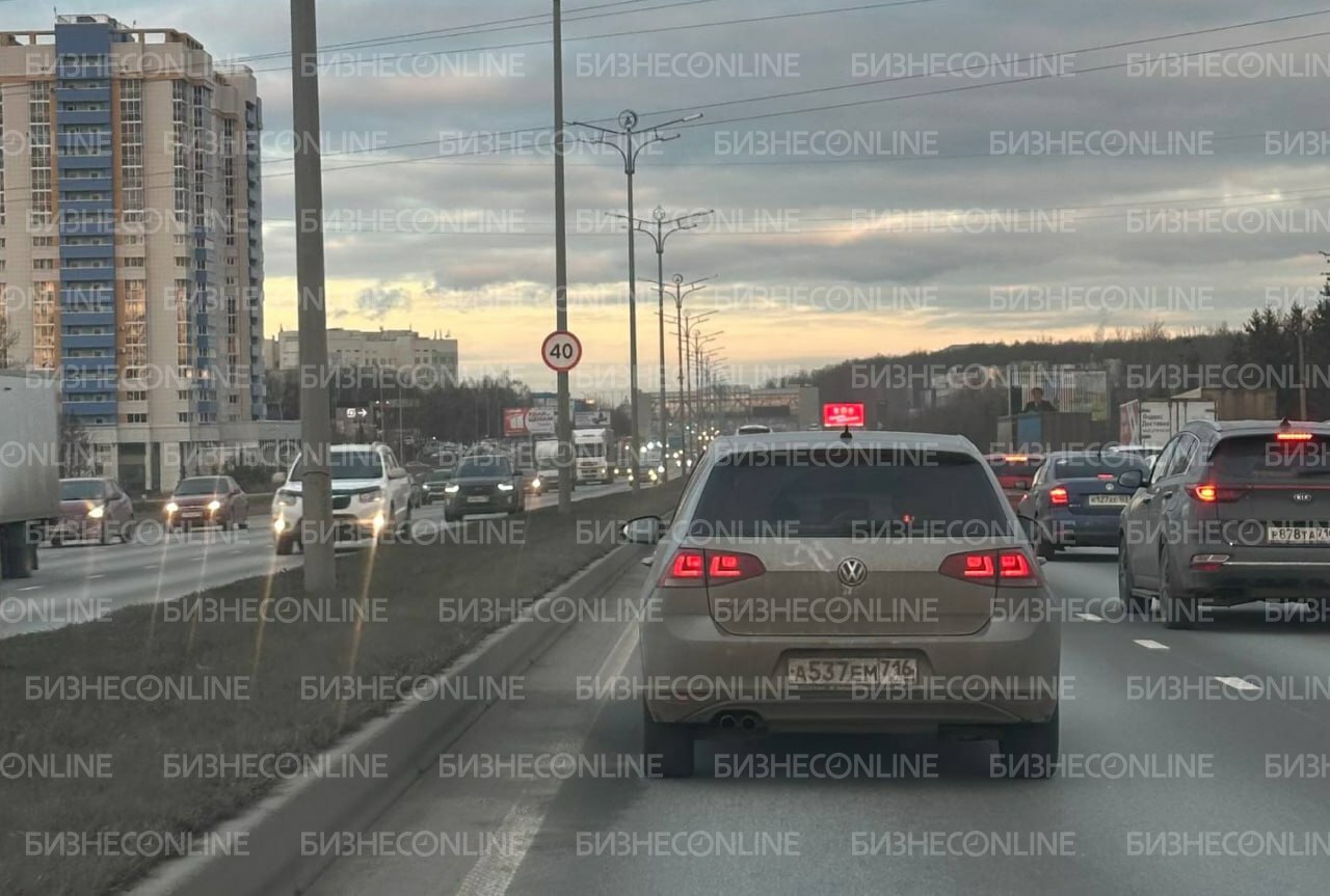 Утром мы писали о пробке, которая образовалась на этом участке дороги. Как обратил внимание корреспондент «БИЗНЕС Online», знак установлен возле АЗС «Таиф-НК». По этой причине скорость потока заметно снизилась.