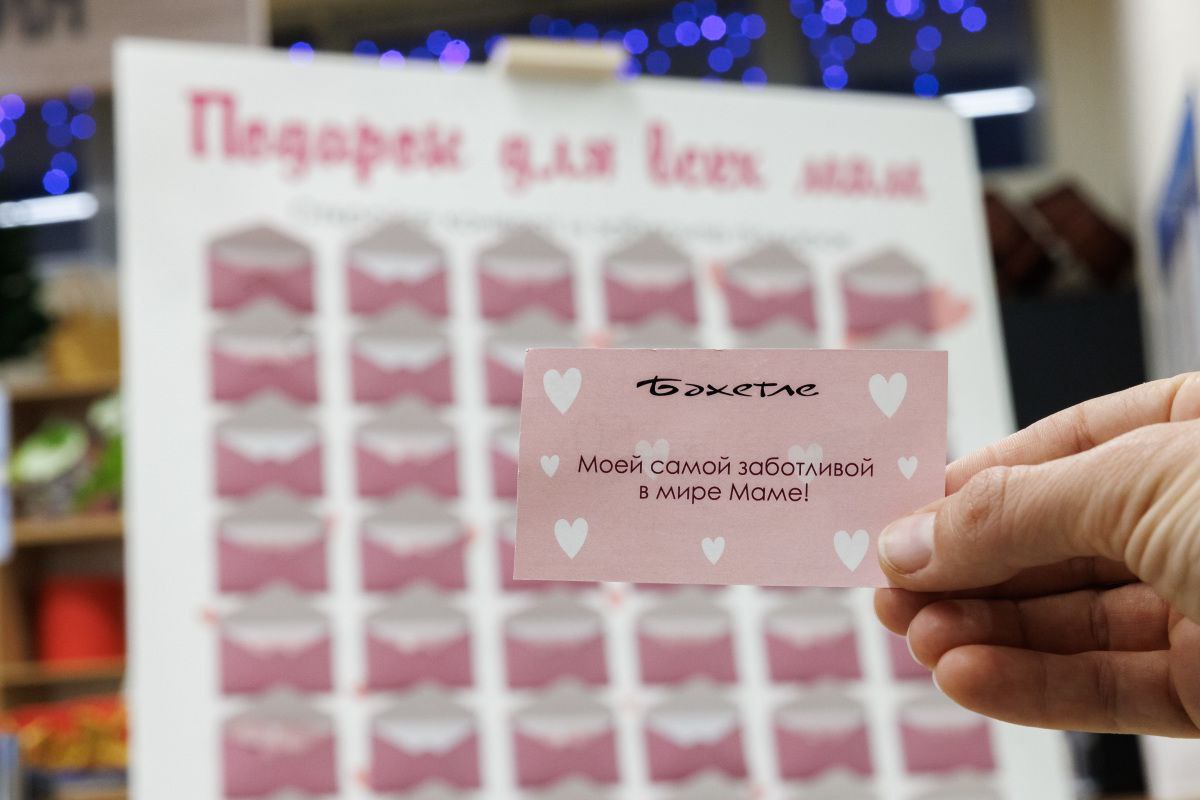 Для компании День матери — особый праздник. В «Бахетле» стремятся сделать так, чтобы каждая мама в этот день почувствовала себя любимой и окруженной заботой. В каждом супермаркете установлен стенд, где каждый может выбрать подарок для мамы — кешбэк на подарочные наборы, праздничные блюда, тематические торты и десерты, выбрать готовые решения или собрать свой уникальный вариант из широкого ассортимента продукции премиум-класса.