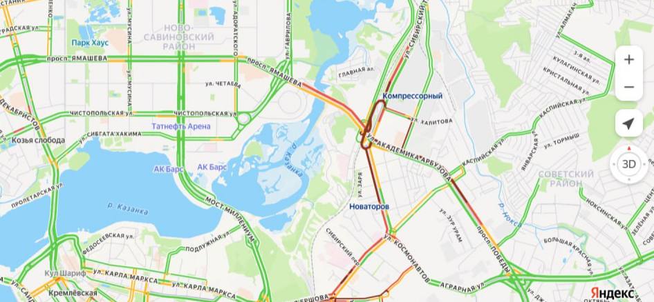 Пробка образовалась у стадиона «Ак Барс Арена» после падения столба на дорогу. Судя по «Яндекс.Картам», она растянулась на 4 км, до магазина «Мегастрой» на проспекте Победы. Как рассказали «БИЗНЕС Online» в мэрии Казани, падение столба произошло после аварии.