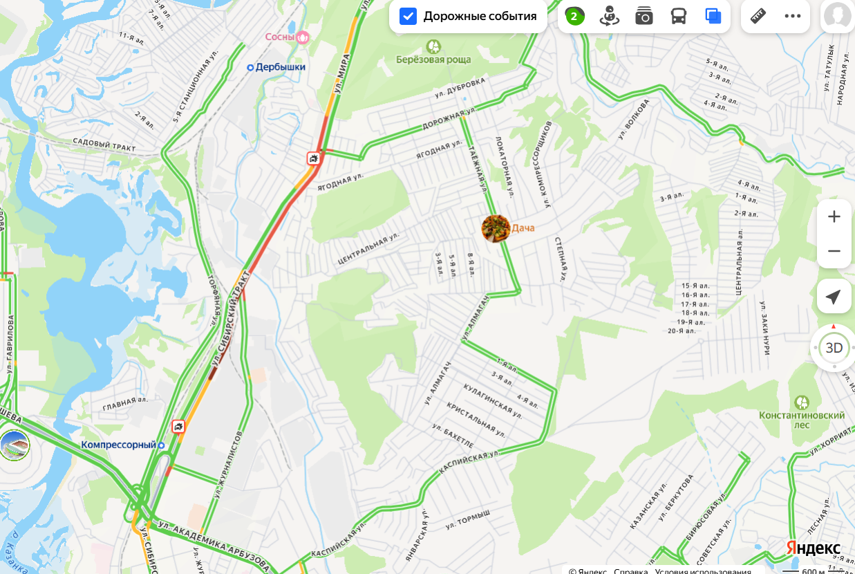 Также движение затруднено со стороны Салмачей и Куюков. Пятикилометровый затор тянется от перекрестка улиц Кул-Гали и Габишева до самой деревни Куюки. Судя по дорожным отметкам, движение парализовано из-за аварии. В целом дорожная ситуация в городе оценивается в три балла.