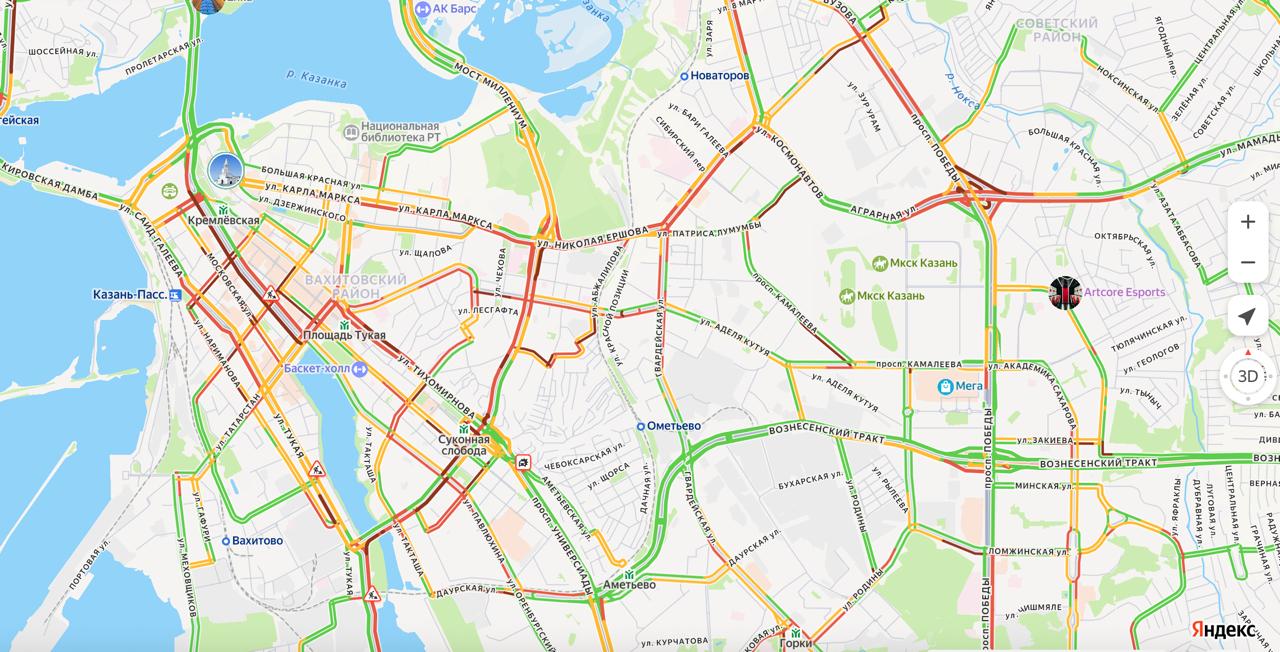 Красным цветом отмечены многие улицы Казани. Движение затруднено у ТЦ «Кольцо» на улице Бутлерова, Пушкина и Ершова. Также трудности возникнут у водителей на Щербаковском переулке, улицах Право-Булачной и Лево-Булачной.