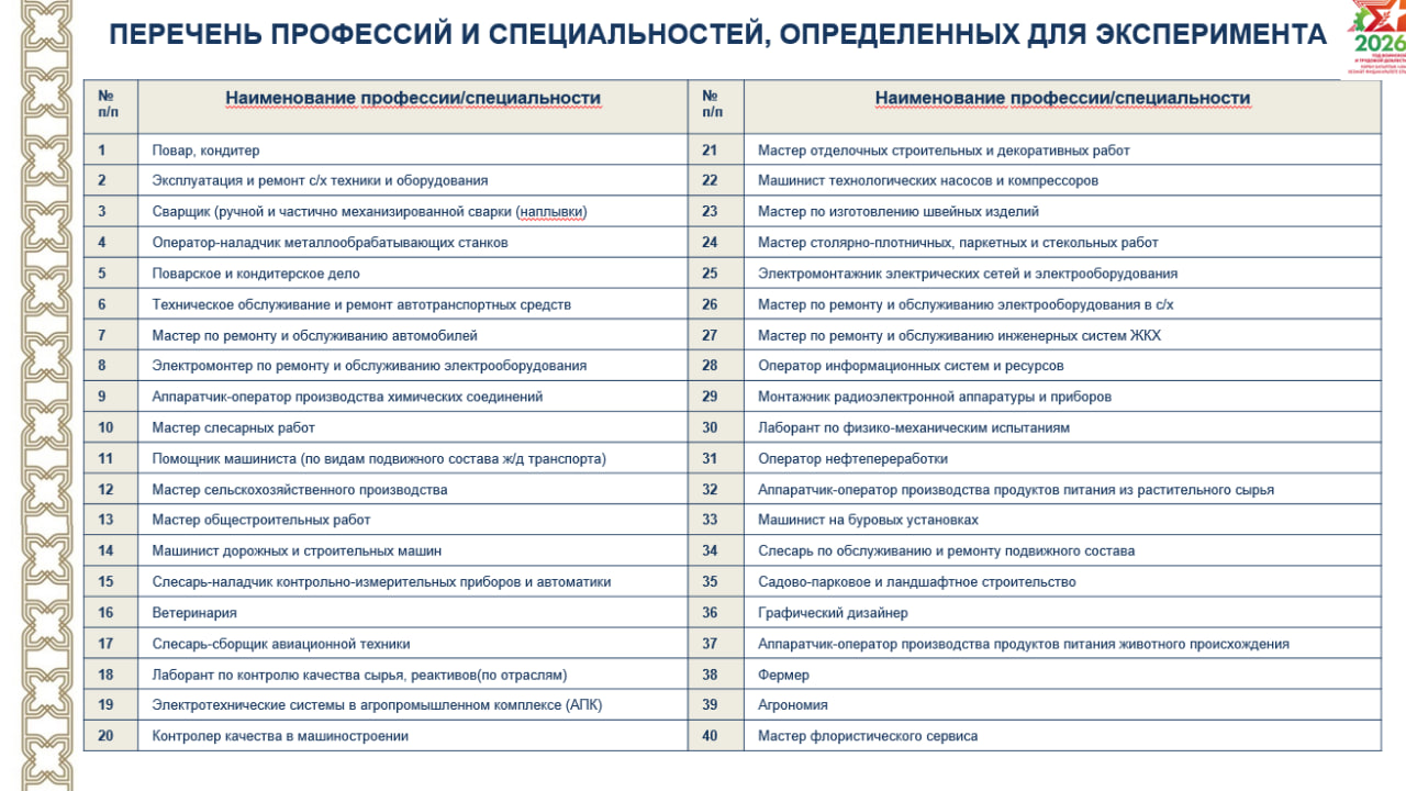 Для профессионального обучения утвердили перечень профессий и специальностей, состоящих из 40 позиций. Среди них повар, кондитер, сварщик, токарь, слесарь, тракторист, электромонтер, мастер по ремонту и обслуживанию автомобилей и оборудования, лаборант, оператор станков и технологических установок, машинист насосов и компрессоров, фермер, агроном, графический дизайнер и др.