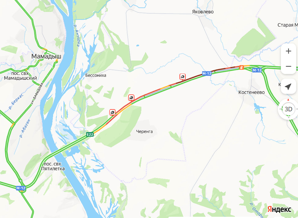 Затор начинается примерно от села Костенеево в Елабужском районе и тянется до поселка Мамыловка, недалеко от моста через Вятку. Отметим, что в сторону Челнов движение менее затруднено.