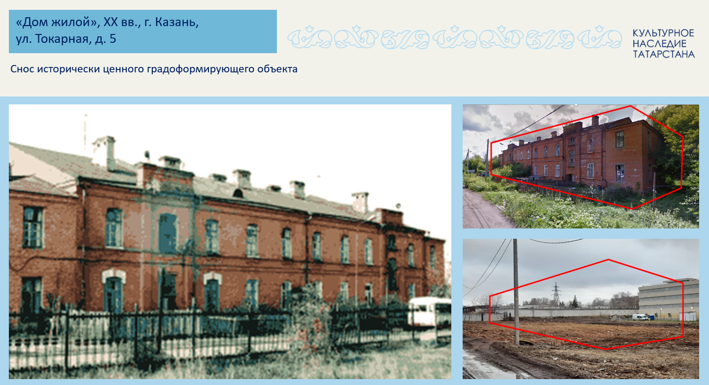 Комитет РТ по охране объектов культурного наследия настаивает на возбуждении уголовного дела по факту сноса исторического здания на Токарной улице, 5 и требует привести в порядок сгоревшие дома на улицах Волкова и Хади Атласи. Об этом сообщает пресс-служба комитета.
