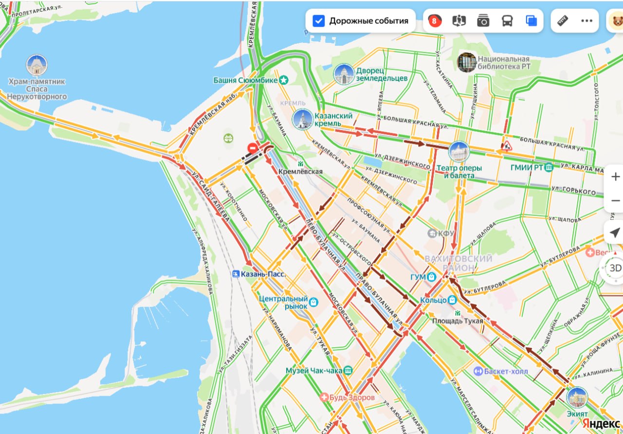 Серьезные заторы наблюдаются и в центре города — на улицах Тихомирнова, Вишневского, Павлюхина, Островского, Карла Маркса, Лево-Булачной, Дзержинского и Кремлевской. В целом дорожная ситуация в городе оценивается в 8 баллов.